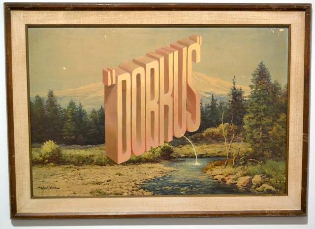 In any case, White's show Dunno at the David Shelton Gallery was pretty much what one expects from a Wayne White exhibit--words and phrases painted more-or-less seamlessly as three-dimensional objects into old mass-produced landscapes.